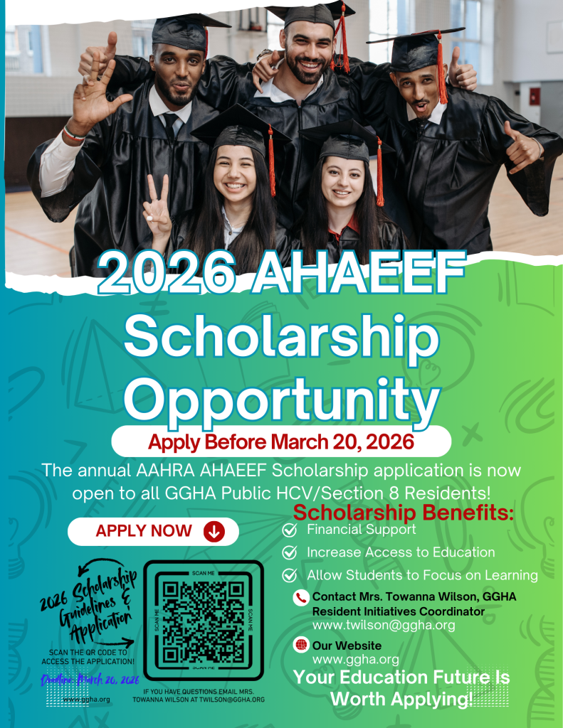 Calling all GGHA Public Housing and Section 8 residents who are ready to take the next step in their educational journey! The 2026 Alabama Housing Authorities Education and Enrichment Fund Scholarship is now open, proudly supporting both graduating high school seniors and adult learners pursuing academic or technical career paths.